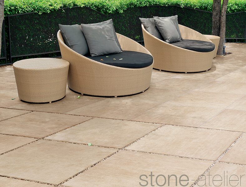 Für den Aussenbereich als Terrassenbelag ist sogleich das Format 60.4×60.4×2.00 und 120.8×120.8 cm verfügbar.