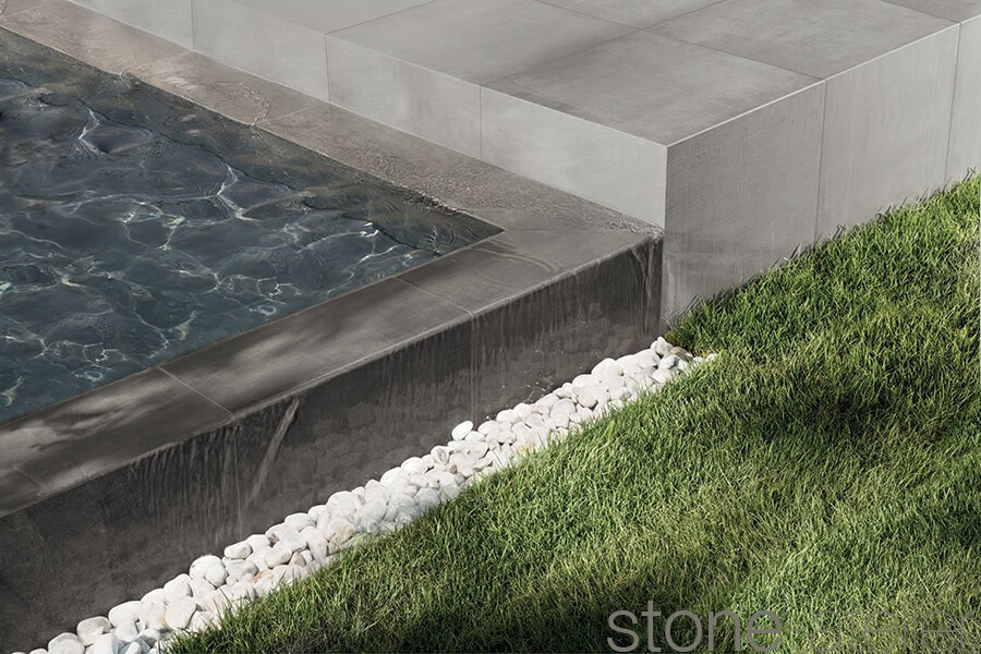 Für den Aussenbereich als Terrassenbelag ist sogleich das Format 60x60x2, 20x120x2 und 40x120x2 cm verfügbar.